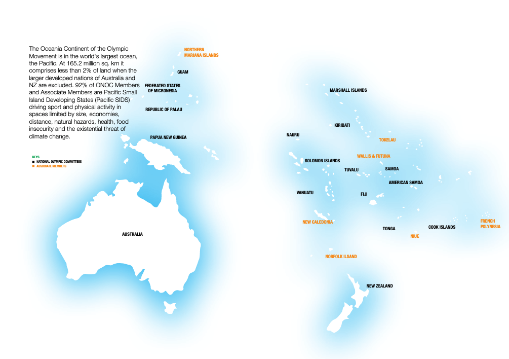 Established in 1981, the Oceania National Olympic Committees (ONOC) is one of five Continental Associations. It looks after the interests of 17 member nations in the Oceania Region, including Australia and New Zealand as well as seven associate members.