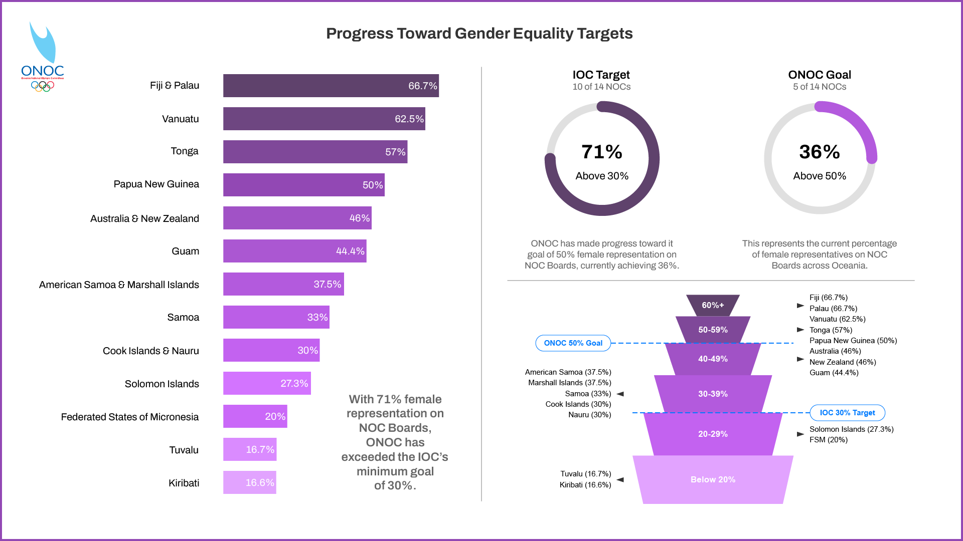 “We are encouraged by the strides made by our NOCs, particularly those that have surpassed the 50% mark in women's leadership representation. This progress aligns with ONOC’s ongoing commitment to governance reforms, gender equality, and strengthening Oceania’s presence in international Olympic affairs,” Dr. Mitchell stated.