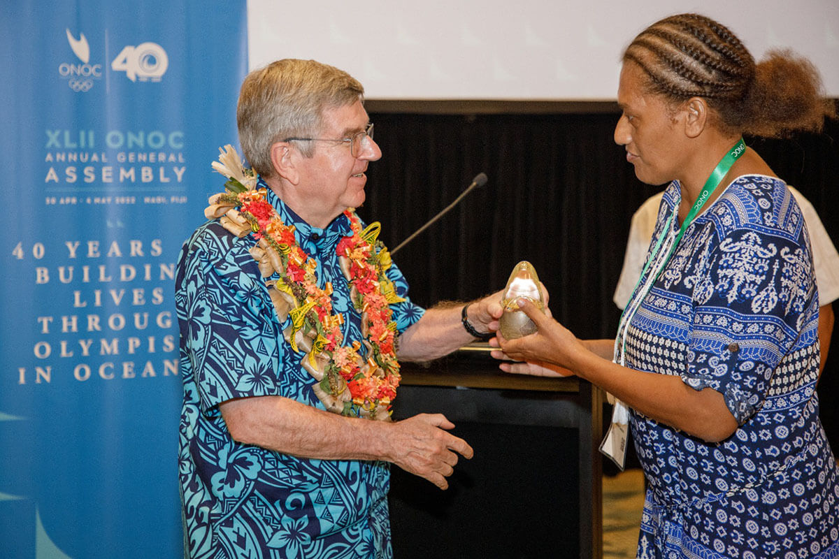 ONOC President Robin Mitchell said, ‘Sainimili Saukuru, past Chief Sport Education Programme Officer of the Oceania National Olympic Committees (ONOC) and Chet Gray, Secretary-General of the Organisation of Sporting Federations of Oceania (OSFO) received their awards from Thomas Bach, President of the International Olympic Committee (IOC).