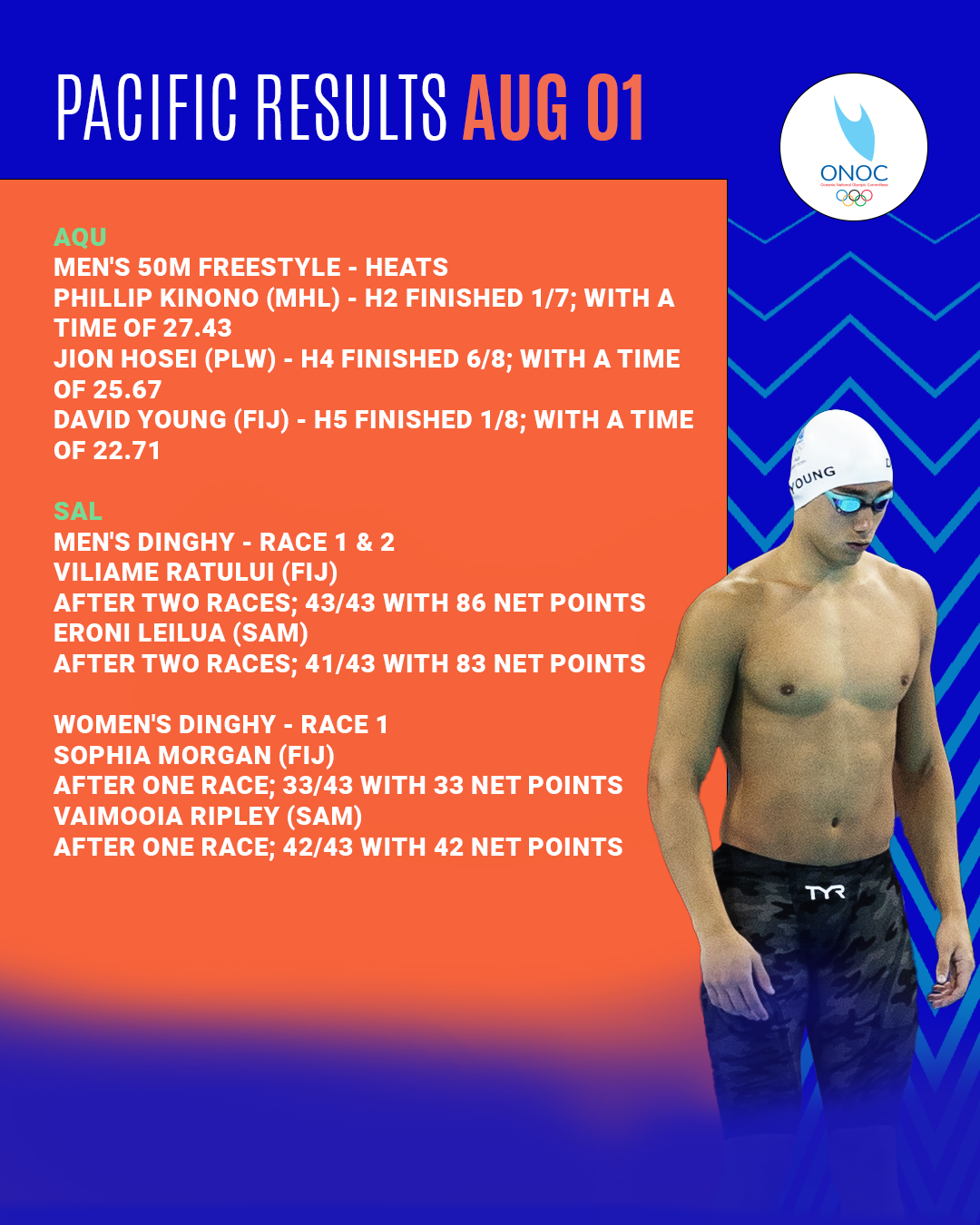 Our Pacific athletes showcased a lot of grit on 01 August in their respective events at Paris 2024. We had teams competing across swimming and sailing events with notable performances, and personal bests.