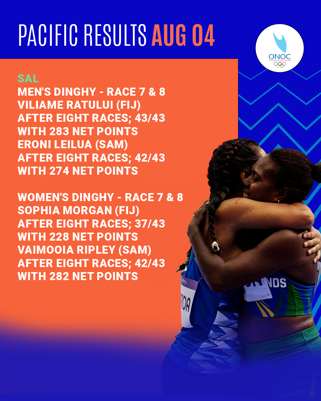 The Pacific NOCs saw another day of determined performances by our athletes with only our sailors in action at the Marseille Marina.