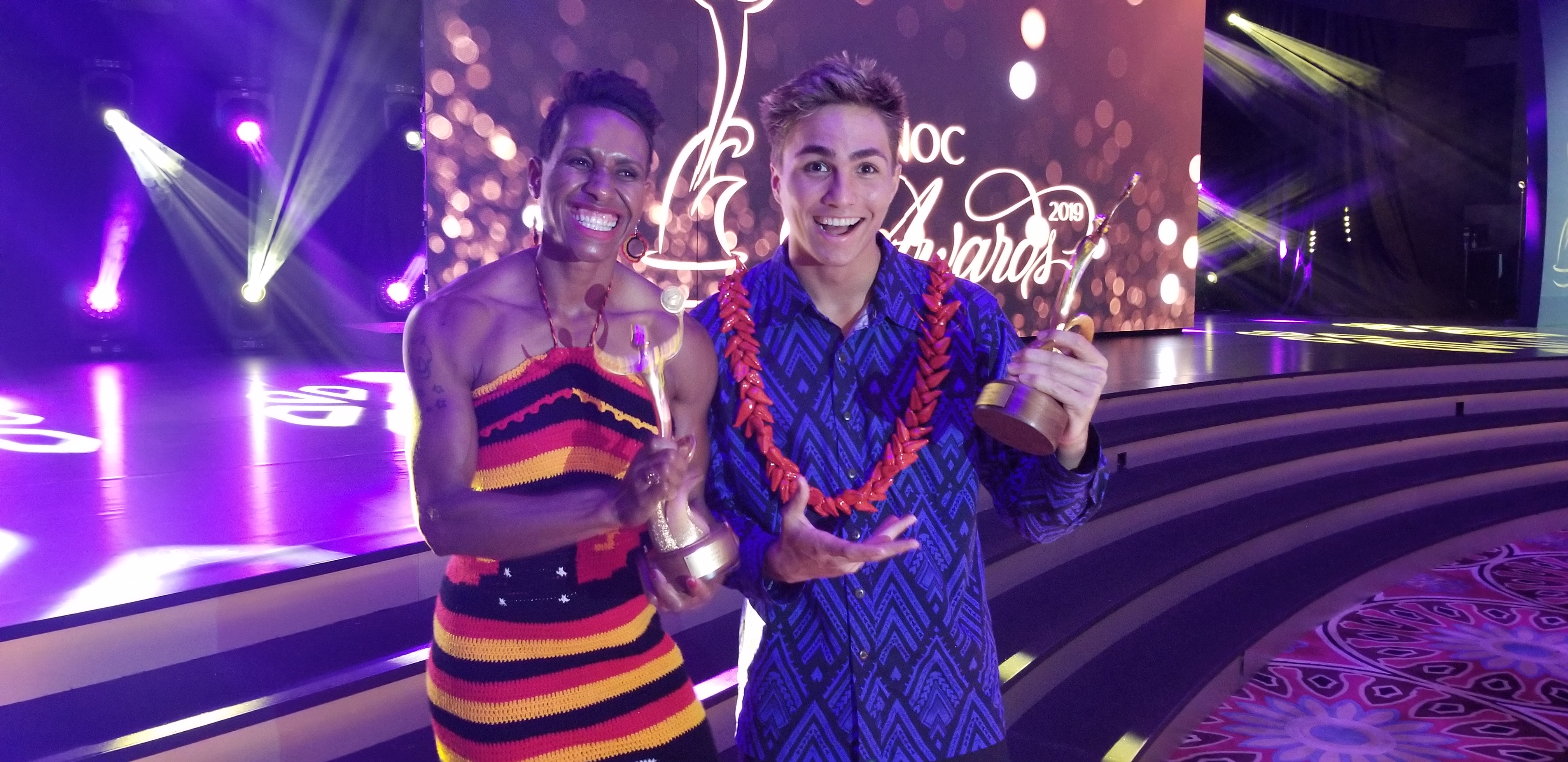 Papua New Guinea sprint queen Toea Wisil and Samoan swimmer Brandon Schuster were awarded the Oceania regions Best Female and Best Male athletes at the ANOC (Association of National Olympic Committees) 2019 Awards held at Katara Hall, Doha, Qatar this evening.