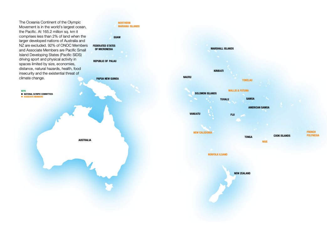 Established in 1981, the Oceania National Olympic Committees (ONOC) is one of five Continental Associations. It looks after the interests of 17 member nations in the Oceania Region, including Australia and New Zealand as well as seven associate members.
