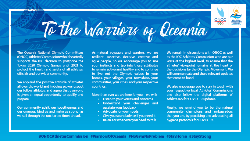 “As natural voyagers and warriors, we are resilient, assertive, decisive, creative and agile people, so we encourage you to use your instincts and tap into this attribute to remain active and healthy and to continue to live out the Olympic values in your homes, your villages, your townships, your communities, your cities, and your respective countries,” the Commission detailed in their statement.