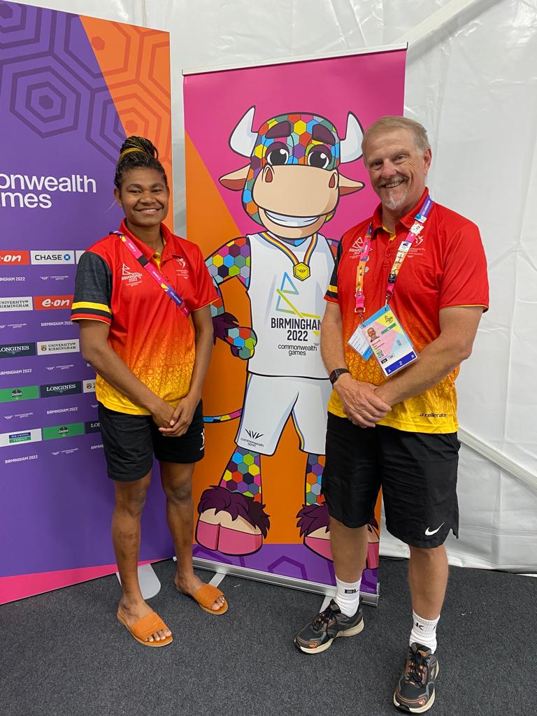 Covid, of course, disrupted training and competitions, “Some of the other girls and I who are based in Papua New Guinea had to train just by jogging in the streets.” As a result, Edna’s second ever event was just four weeks ago at the Pacific Mini Games where she picked up the gold medal! So the Commonwealth Games was only her third competition overall. Here she picked up three personal bests in the High Jump, Shot Put and Javelin and a personal best overall point score. “Javelin’s come up seven metres since she first started. We went another three metres last night,” Brett gushes.