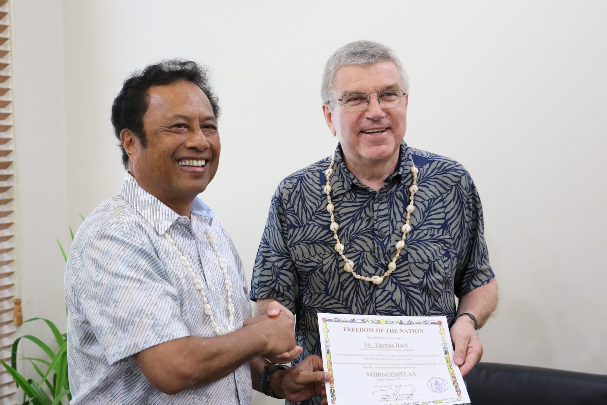 President Remengesau Welcomes International Olympic Committee (IOC) to Palau May 10th 2019 – Palau President Tommy E. Remengesau, Jr. welcomed IOC President Thomas Bach to the Republic of Palau during a courtesy visit made at the National Capitol in Ngerulmud, Melekeok.
