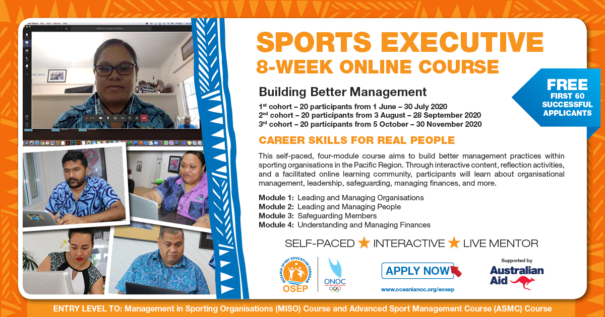 “It is a self-paced, 4 module online course to help NOCs and NFs build better management practices within sporting organizations in the Pacific. This year we are offering 3 cohorts with a maximum of 20 participants per cohort,” said ONOC Secretary General Ric Blass in his circular to NOC Presidents and Secretary’s General.