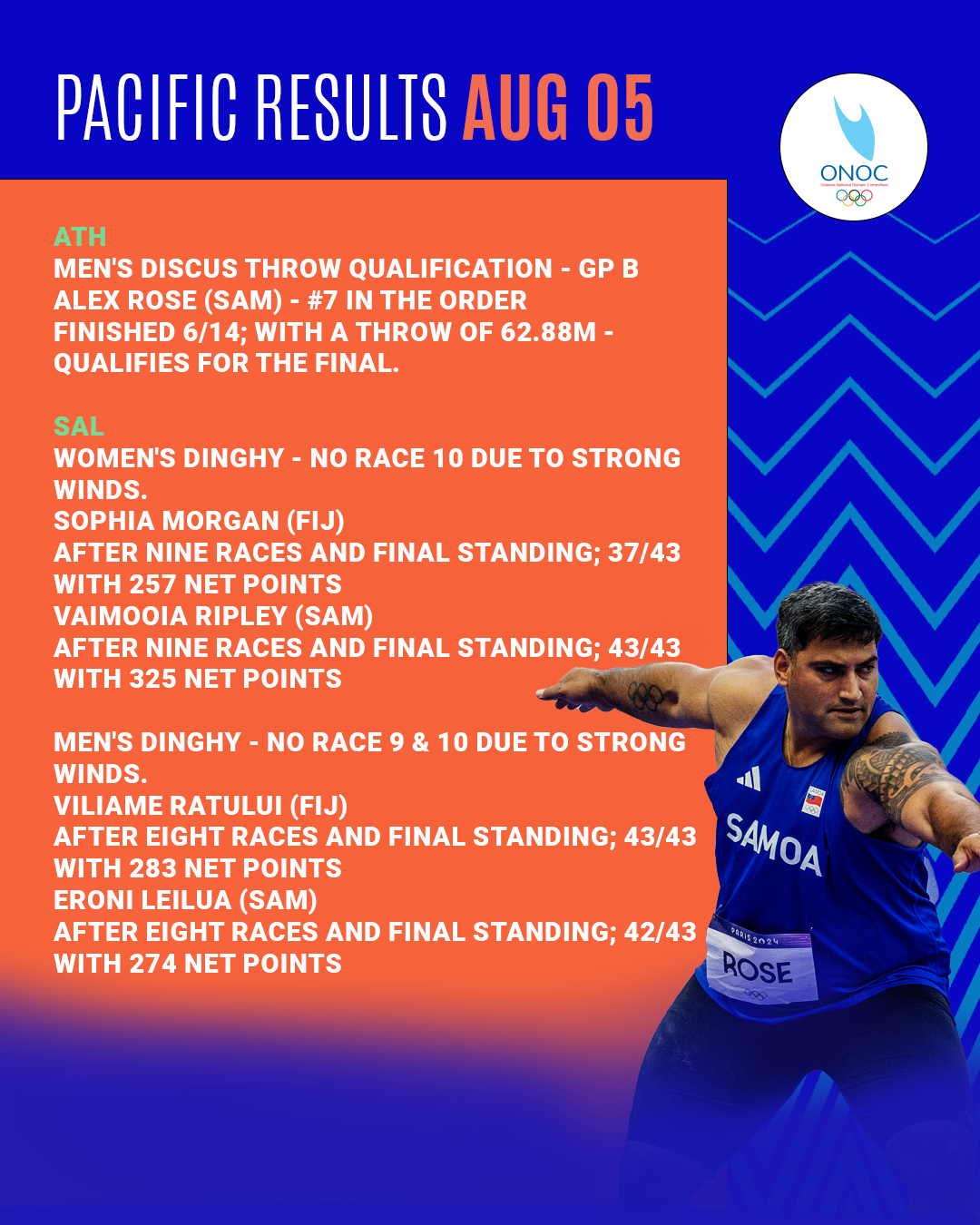 While Alex Rose’s historic qualification for the discus throw finals brought a moment of triumph for Samoa, our sailors in Marseille battled against the elements.