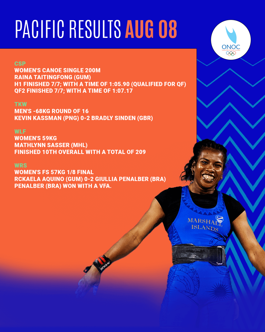 Mathlynn Sasser from the Marshall Islands competed in the Women's 59kg Weightlifting event, finishing 10th overall with a total lift of 209kg. This marks Sasser’s second Olympic appearance, following her debut at Rio 2016, solidifying her status as a regional powerhouse in weightlifting.
