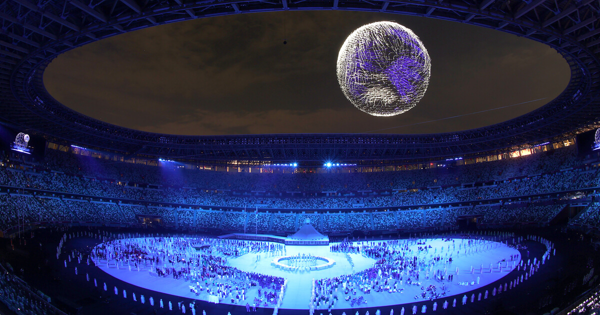 As international singers performed John Lennon’s ‘Imagine’ a pre-recorded video shot in different locations around the world, athletes were treated to a stunning drone show in the Tokyo sky.